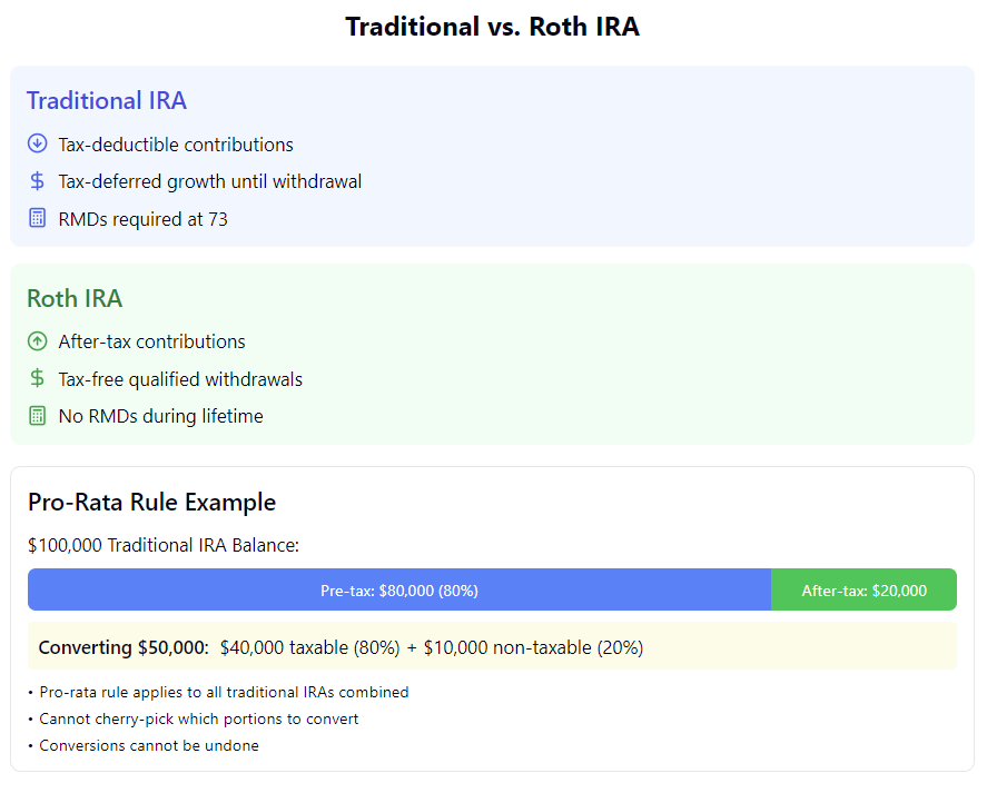 However, it’s important to understand the pro-rata rule. If you have both pre-tax and after-tax money in your IRA, converting to a Roth IRA means you’ll pay taxes on a portion of the pre-tax amount.