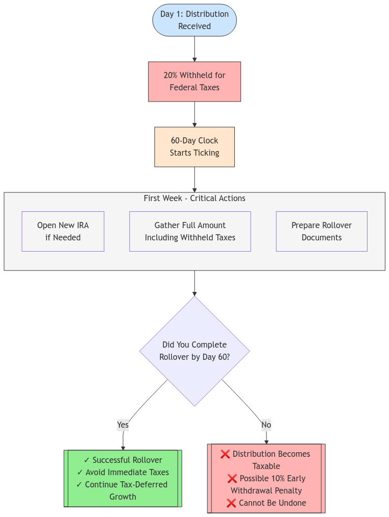 This rule gives you 60 days to deposit your lump sum distribution into an IRA to avoid taxes. Miss the deadline, and the distribution becomes taxable and possibly subject to penalties.